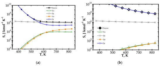 For the Pd/ZrO2 catalyst (Figure 4b), total entropy production is close to the flow friction component in the whole temperature range analysed. The transport component SD, SH are minor due to low gradients (a result of slow kinetics), and even the reaction component SR is much lower than the flow friction one, SF.