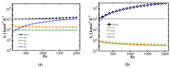 Comparison of entropy production components vs. Reynolds number for knitted wire gauze, T = 773 K, CH4 inlet concentration: 200 ppm: (a) fast kinetics, Pd/Al2O3 and (b) slow kinetics, Pd/ZrO2.