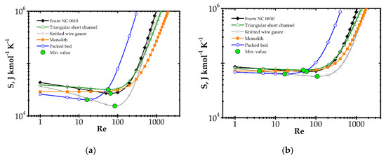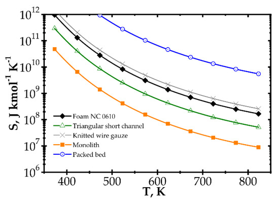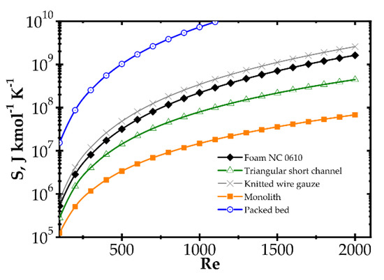 In Figure 6, entropy is presented for two selected temperatures, moderate (573 K) and high (773 K). For the moderate temperature of 573 K (Figure 6a), packed bed seems the best for Re < 20. For Re < 500, knitted wire gauze is optimal (minimum value at Re = 84) in that this results in the lowest entropy production and the most profitable behaviour within this analysis. For a higher Reynolds number, monolith displays the lowest entropy production, undoubtedly due to its lowest flow resistance. For higher temperatures of 773 K (Figure 6b), the impact of transfer properties is more pronounced as a result of faster reaction rate, and knitted wire gauze appears to be the best with classic and short-channel monoliths. Packed bed produces the largest entropy in almost the entire Reynolds range, due to the highest flow resistance. For the higher temperature (773 K), the minima are generally slightly shifted to higher Reynolds numbers and entropy production is several times higher.