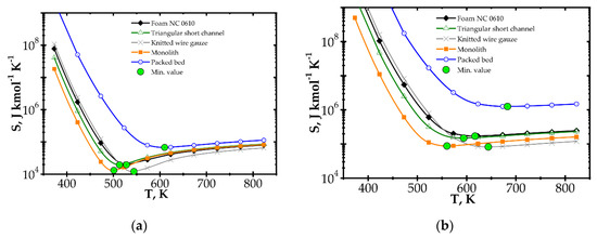 When considering temperature influence on entropy production (Figure 7), the same conclusions may be derived. Low process temperature is favourable for the classic monolith, while for higher temperatures, wire gauze and monolith seem to be the best choice. For Re = 100 (Figure 7a), above 650 K, all the internals display close entropy production. Interestingly, all the structures except packed bed show minima within the narrow range of 500–540 K. For Re = 500 (Figure 7b), entropy produced is higher, especially for packed bed. The minima are shifted towards higher temperatures by 60–100 K. Above 600 K, knitted gauze and monolith are the best.