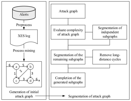 The proposed attack-modeling algorithm attempts to aggregate low-level, less readable cyber alerts into cyber attack graphs. As shown in Figure 1, the framework of the algorithm consists of three modules which including two part: Generation of initial attack graph and segmentation of attack graph.
