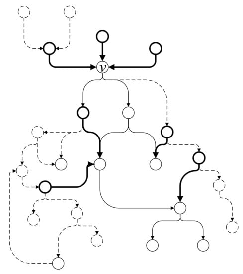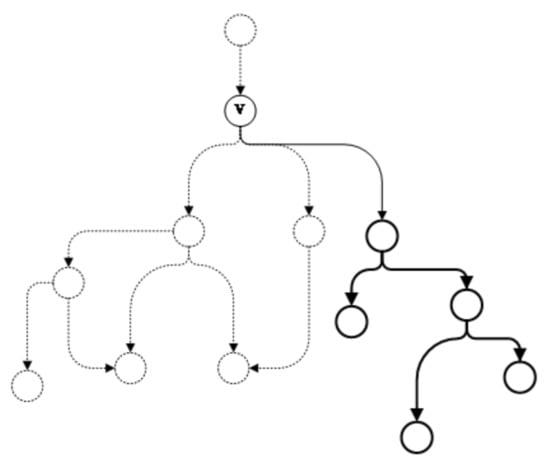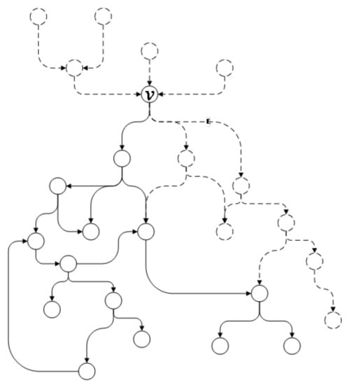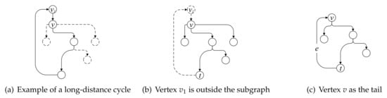 In the first case, from vertex v, the proposed algorithm traverse downwards until it reaches vertex . If vertex does not belong to subgraph and vertex and v are not the same vertex, then is considered to be a vertex beyond subgraph . The algorithm will move back to the previously visited vertex t and then remove vertex and the directed edge from to v from the candidate subgraph . The vertices and the edges indicated by the solid lines correspond to the final subgraph after removing the long-distance cycle, as shown in Figure 6b.