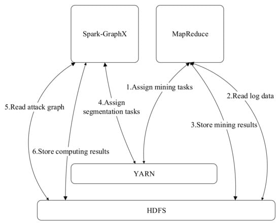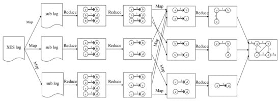 Process mining, also known as workflow mining, aims to build a workflow model according to the execution of process instances recorded in the event log, which is mainly used for process analysis. Process mining aims to discover, monitor, and improve real processes by extracting knowledge from event logs readily available in today’s information systems [4,5,6]. Process mining can also effectively extract attack patterns from intrusion detection alerts [7]. However, in current works, researchers tend to build a large attack graph with numerous vertices and edges to describe all the cyber-attack behaviors. The problem is that such a graph is too complex to be analyzed by humans [8,9], which is essential for defending cyber-attacks in practice. Current models tend to build a large attack graph with numerous vertices and edges to describe all the cyber-attack behaviors. Such a graph is too complex to be analyzed by humans. Although a robust automatic checking technique can be implemented to analyze the attack graph. Manual analysis by the network security administrator is still an important means to ensure network system security in practice. Because an experienced network security administrator can effectively discover the potential danger latent in the attack graph. Furthermore, the network security administrator can carry out a directed and specific action to prevent attack from intruders. Although some researchers have proposed some methods to simplify or segment attack models, some problems remain such as low efficiency and information loss. Furthermore, regarding process mining, few related works consider employing a distributed architecture to process massive intrusion detection alerts. In previous studies, only some data pretreatment methods, such as a combination of duplicate alerts and assignment of priority to alerts, have been adopted to reduce the computational efforts [10,11,12]. Therefore, to improve the algorithm’s capability of processing massive security alert data, it is necessary to introduce a distributed architecture [13,14].