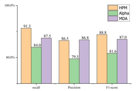 As shown in Figure 12, the recall rate of the heuristic process mining algorithm (HPM) reaches 91.3%, the precision rate reaches 85.7%, and the F1-score reaches 88.8%, which are better than the other two compared algorithms. The experiment results prove that the HPM can cover most of the attack sequence that occurred. Thus, the HPM can effectively extract the intruder’s attack strategy and possible attack steps from the security alerts because it can better eliminate the influence of noise during the mining process.