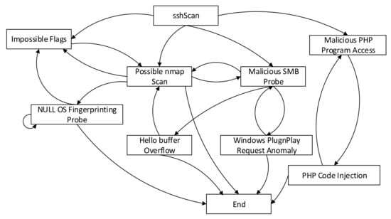 Here, we analyze the No. 11 subgraph to verify the validity of the segmentation results. As shown in Figure 13, it can be seen from the No. 11 attack subgraph that the intruder who performed the sshScan scan attack will normally complete four types of attack behaviors during the next step: Impossible Flags (using the flag of the invalid Transmission Control Protocol (TCP) header, a denial-of-service (DOS) attack), Nmap scanning, malicious Server Message Block (SMB) probes, and malicious PHP programs. The first three types of attacks may be subsequent attacks of one another. After using the SMB probe, the attacker will use the Windows system vulnerability for the Microsoft SQL Hello Buffer Overflow attack (an attack that exploits MS SQL vulnerabilities) or cause a Windows Plug and Play exception request. However, if the intruder uses a PHP malicious program after sshScan scan, the intruder will use the PHP code injection to execute a further attack. From the aforementioned example, it is obvious that the attack subgraphs’ output by the proposed algorithm can clearly reflect the intruder’s attack pattern.