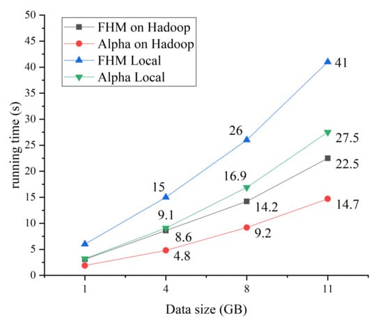 We analyze the time performance of the standalone version and distributed version of the proposed HPM algorithm and Alpha algorithm. The distributed version runs on a Hadoop cluster of four nodes. We chose the security alerts raised during two weeks of July and the amount of security alerts was 11.4, 8, 4, and 1 GB, respectively. The time performance of the four algorithms is shown in Figure 14.