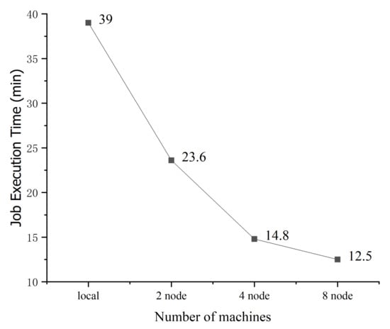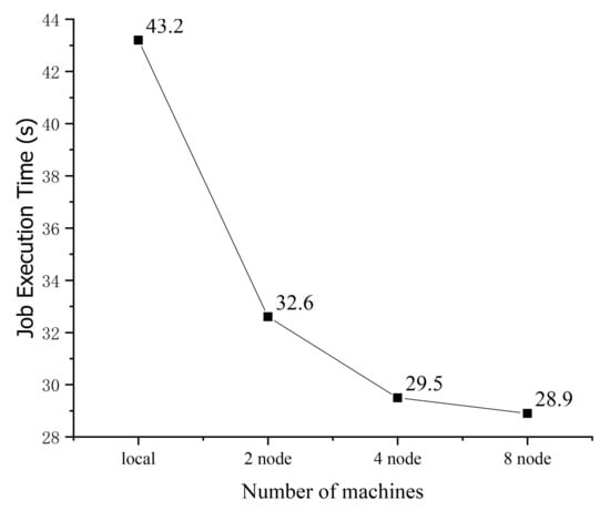 Next, we analyze the impact of the number of nodes on the runtime of the compared algorithms with a log size of 11 GB. The experimental result is shown in Figure 15 and Figure 16. With two cluster nodes, the HPMoMR runtime is reduced by 39% compared to that of the standalone version. With four cluster nodes, the runtime is reduced by 62% because the original data can be simultaneously processed in multiple nodes, which effectively alleviates the Input/Output bottleneck. However, with eight nodes, the runtime is only reduced by 67% mainly because the I/O bottleneck can be effectively addressed in the case of four nodes. In addition, in the MAP task, the number of partitions increases as the number of nodes increases and the communication cost between nodes increases. Therefore, the time performance does not appreciably improve as the number of nodes increases from 4 to 8.
