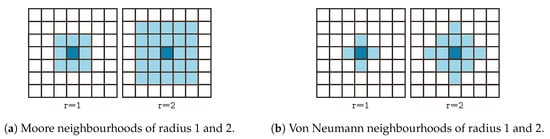 A CA is represented by a set of cells disposed on a grid, and a set of transition rules. At each point in time, cells are in a given state, evolving from an initial state. The rules dictate how cells change their state locally, based solely on the current state and the states of the neighbouring cells. The rules are applied simultaneously for all cells, at each time step. A CA neighbourhood system determines the connectivity pattern between each cells and the other cells in the system [21]. The two most popular such neighbourhoods are the Moore and von Neumann neighbourhoods [19,22], which are exemplified for 2D grids in Figure 1.