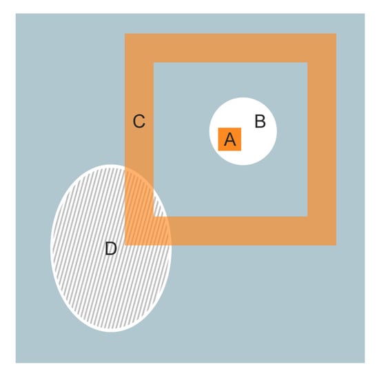 Example of a scenario where a band-based neighbourhood captures information that is not local enough for the classical neighbourhood. A: The current cell analysed by the algorithm; B: foreground object which contains no seed pixels; C: remote neighbourhood of cell A; D: foreground object which contains seed pixels.