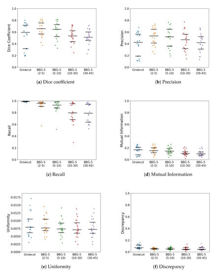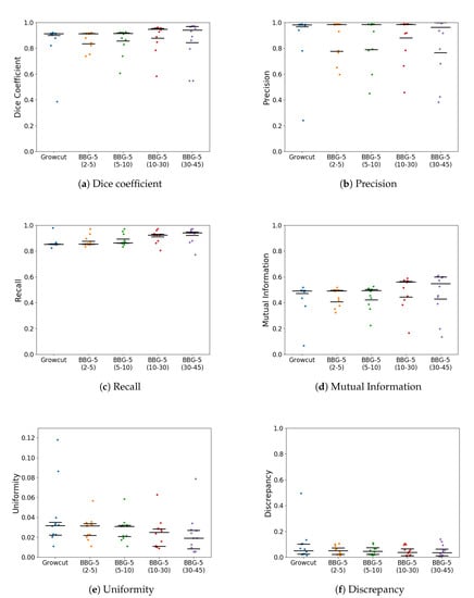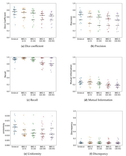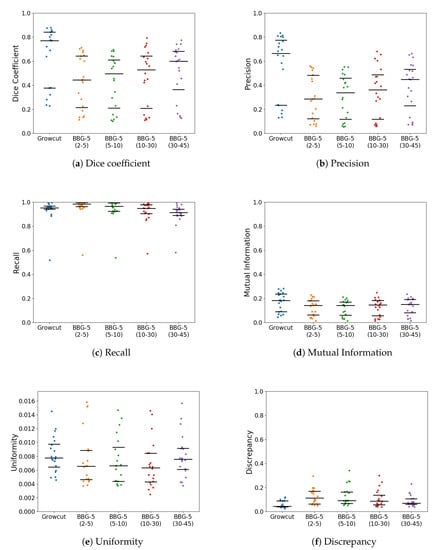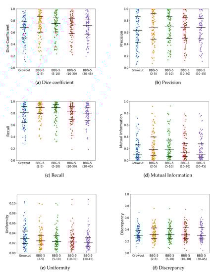 In order to directly compare the performance of BBG configurations with GrowCut’s performance, we also analyzed the image-level difference in performance for these algorithms (i.e., increase/decrease in performance of each image when processed using a BBG configuration relative to GrowCut). These results are consistent with our other results, yet they show a smaller variance in the measured performance metrics, since they factor out the influence of individual images. This set of results is available in the Supplementary Material (Supplementary Figures S1–S5).