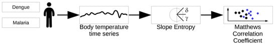 Block diagram of the study. Body temperature records from dengue and malaria patients were recorded over 24 h. The corresponding time series were processed using Slope Entropy, and then classified using a single threshold obtained from the Receiver Operating Characteristic (ROC) Curve. The performance was assessed using the Matthews Correlation Coefficient.