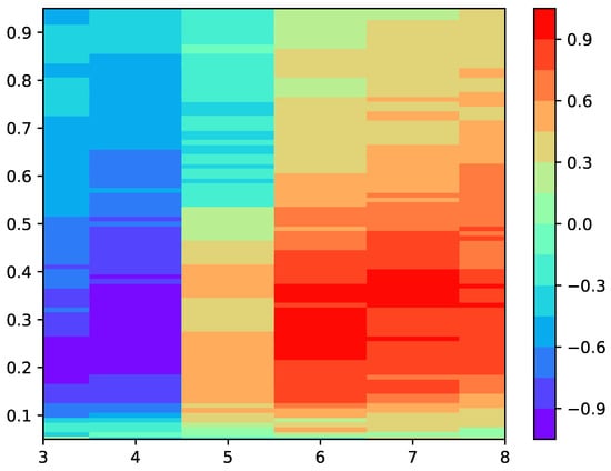 It can be stated that the classification performance in terms of MCC was reasonably quite stable, with almost the entire grid above 0.5 (or its reverse), and many regions around 0.8–0.9, making the selection of the input parameter values less critical. For stability, we chose and .