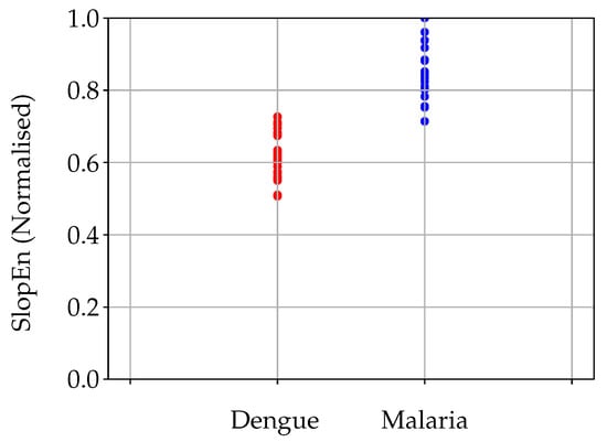 Cloud plot of the two classes under analysis, dengue and malaria. Dengue records had a significant lower SlopEn values than malaria records. The separability of these two types of temperature records is visually very apparent, as confirmed by the numerical result of MCC (0.9066) for and .