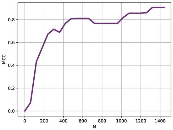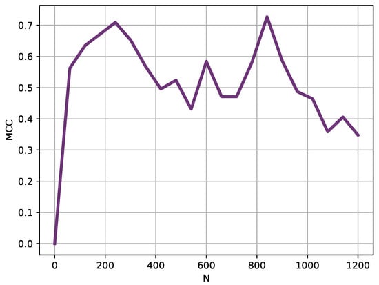 Length (N) analysis results. Instead of using the entire records, shorter versions were used in this analysis. Starting at 60 samples long, length was progressively increased in 60 samples steps. With lengths slightly above 200 samples, the MCC obtained was very high already, that is, the records were clearly separable using only 3–4 h of temperature data.