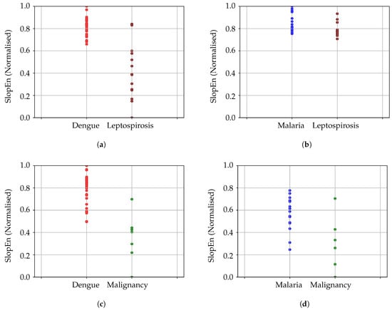 The comparison between DE and MA temperature records has provided clear evidence of the possible separability of both diseases based solely on the SlopEn analysis of the corresponding time series. However, it could be stated that these two diseases are not more than a successful example that does not necessarily demonstrate any generalization capability when applied to other diseases.