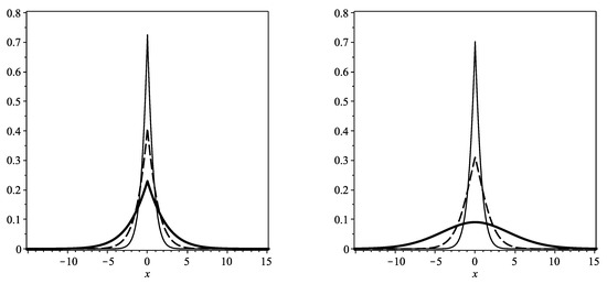 Plots of Equation (26), the algebraic solution to Equation (14), (left), and Equation (27), the algebraic solution to Equation (15), (right), at times (solid line), (dashed line) and (bold solid line). The reaction parameter , and the fractional order derivative is taken to be in each of these plots.