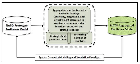 Hodicky et al. [] write about growth potential, such as adding more countries to the model via an appropriate aggregation mechanism and bringing parametrization of strategic shocks (i.e., adding user-specified shock parameters). Accordingly, NATO has developed an aggregated resilience model as an upgrade of the extant prototype by activating the mentioned growth potential. The main objective of the aggregated model employing system dynamics paradigm is replicating key factors and parameters of resilience for a comprehensive and seamless resilience assessment for NATO strategic level decision-makers. The structure of the aggregated resilience model, aggregation mechanism, and shock parametrization methodologies used in the development of the model comprise the scope of this study.