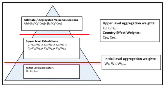 The aggregation mechanism, parametrized strategic shock input structure, and decision support output structure are the prominent features differentiating the aggregated model from the former prototype version. This is all about assigning criticality (importance), magnitude, and effect weights to resilience parameters, countries, and strategic shocks that already exist in the previous version. Because there are relative differences among resilience related variables and parameters in real life, the use of a systematic weight allocation process that can approximate the outcomes of the model to the real-life behaviours was inevitable. While the exact measurement of resilience is hardly possible because of its conceptual complexity, weight assignment to resilience parameters can be one of the initial steps to confirm assumptions []. Resilience is a complex system that represents dynamic behaviours through its complicated structure with various nodes, interrelations, and information flows []. Such behaviours can be exemplified as the dynamic ones stemming from current and future battlefield environments [] that are characterized by non-state diplomatic activities, information, and military and economic actions that create secondary and tertiary effects. Even though it is sometimes perceived as ordinary, the weighting process is critical because of its power to mitigate prejudice in decision-making []. As such, the Analytic Hierarchy Process (AHP) being a multi-criteria decision-making tool was used for aggregation and parametrization purposes. The AHP-based weight allocation process gives opportunities for the users to create more what-if scenarios. Moreover, with the help of this process, users can enhance the granularity of the model and, thus, increase the quality of causal explanations especially needed by high-level decision-makers.