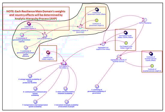 National and international policymakers have recently been focusing on the resilience concept as one of the most critical sustainability measures for their organisations []. As an international military organization, NATO is not that different than these other organisations. In this regard, NATO has developed a prototype resilience model that can provide foresight regarding the NATO resilience changes over time []. With the help of the system dynamics modelling and simulation paradigm, the prototype model is capable of evaluating the resilience capacity of a country and dynamically assessing its resilience-based risk. The outcomes of the model comply with NATO’s strategic resilience concept []. The strategic resilience concept is an adaptive process in which resilience performance is measured by absorbing strategic shocks with minimal impact while maintaining essential functions at an acceptable level, then recovering functionality at a reasonable time and a reasonable cost. Therefore, a well-integrated system specifically focuses on managing the local consequences of an attack and isolating the event from the overall system function, thus making the adversary’s value proposition unfavourable. Subsequently, the system adapts and increases its capacity to withstand future shocks with reduced vulnerability exposure to the adversary and increased speed of system recovery [].