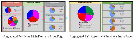 The most distinctive feature that distinguishes the aggregated model from the prototype one is the aggregated decision support system output page. This page is exclusively designed for the strategic level decision-makers (i.e., FOGOs—Flag and General Officers) to obtain a comprehensive situational awareness about aggregated resilience and risk values of countries by the help of color-coded displays [Red → reduced capacity (0–0.4); Yellow → moderate capacity (0.4–0.7); Green → sufficient capacity (0.7–1.00)].