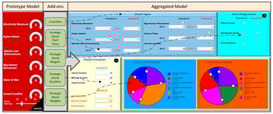 In the prototype model, the users were only able to select relevant shocks (0: no shock; 1: shock) for a country with the same start day for each shock. The extant limited capacity of the prototype model showed us the necessity of approximation of the prototype model to the real world. The add-ons applied to the prototype model include one more country addition to the model, separate start time determination capability for each shock and each country, three different shock magnitude (minor, moderate, strong) assignment capability for each country, determination of shock evolution durations (absorb, recover, adapt) for each country, and AHP-based shock effect weight injection capacity. Although the aggregated model runs with two countries at the moment, it has an infinite capacity to deal with more countries.