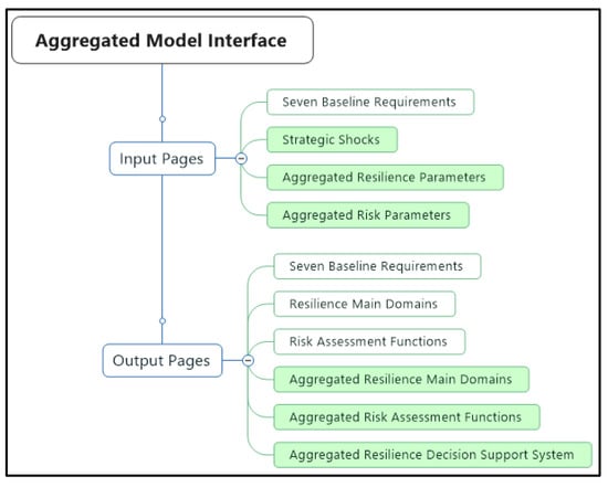 The aggregated resilience model includes both input and output dashboards, as was the case in the prototype model. We have upgraded the dashboards by developing three input and three output new pages (green color-coded in Figure 6).