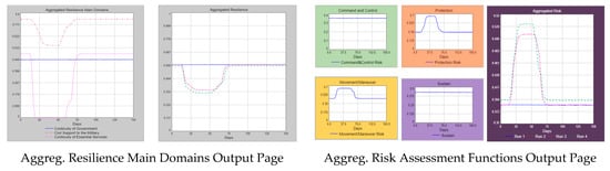 The seven baseline requirements input page allows the users to insert values of 15 different parameters for each country. There are various insertion options on the page, such as numeric input, slider, and knob. The newly developed input pages have already been discussed above. Screenshots of the aggregated resilience main domains and aggregated risk assessment functions output pages are provided below (Figure 7). The aggregated resilience main domains output page shows both time-based graphical results of each resilience main domain and NATO’s aggregated resilience upon each simulation run. Alike, the aggregated risk assessment functions output page includes the output values of each risk assessment function and the aggregated risk.