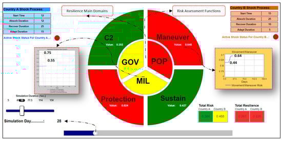 The add-ons, such as the parametrized strategic shock input page, AHP-based weighted resilience, and risk parameters input pages, one more country insertion to the model, and the decision support system page fill the development space discussed by Hodicky et.al. []. The user interfaces help decision-makers modify the values of selected parameters of different countries concurrently and see the time-based results both in graphs and color-coded displays. Moreover, the model has the potential to enhance the evaluation and foresight capacities of NATO’s communities of interest in the areas of resilience and civil-military cooperation.