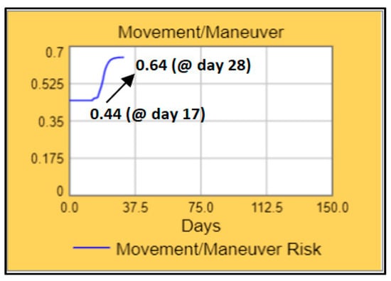 When we check the aggregated risk assessment functions that are depicted on the outer circle, C2 (command and control) and sustain risk functions are green color-coded with the values of 0.35 and 0.42 (i.e., the aggregated risk levels in these functions are low and manageable). Comparatively, we see red colour codes for manoeuvre and protection risk functions with the values of 0.64 and 0.62 (i.e., the aggregated risk levels are high and difficult to manage). This decision support output page enables users to see the details of both risk functions and resilience domains by just clicking on the related piece of the circle. The users can see the details of the situation that are producing the colour codes that are seen on the page. If we click on the manoeuvre piece on the outer circle, we see the increase in aggregated risk assessment function (0.44 → 0.64) on the graph covering the duration of Day 0–Day 28, as shown in Figure 9.