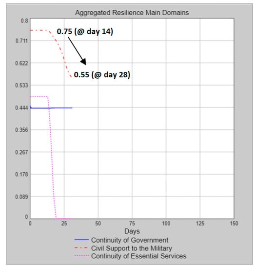 Concerning the aggregated resilience main domains, we see yellow colour codes for two domains, such as continuity of government and civil support to the military (i.e., the aggregated resilience capacities are at moderate levels). For the continuity of essential services domain, the colour code is red, meaning that there is a reduced aggregated resilience capacity for this domain. The details of the resilience situation up to Day 28 can be seen on the graph that is opened by a click on the related piece on the inner circle. For example, the decrease in the aggregated resilience value of the civil support to the military domain (0.75 → 0.55) is depicted on the graph presented in Figure 10.