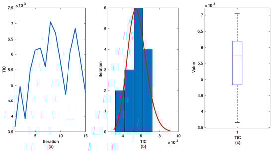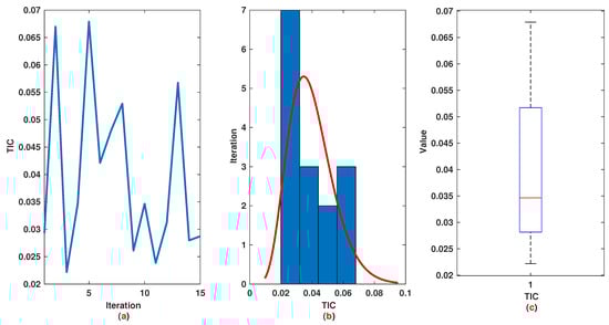 Example 2: (a): The value of TIC at each iteration; (b): Histogram plot for TIC; (c): Box plot for TIC.