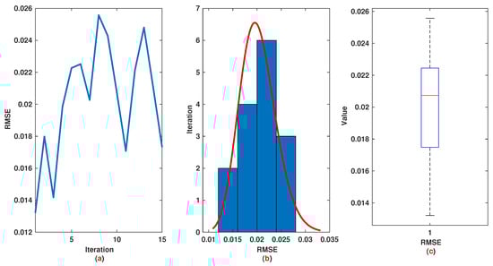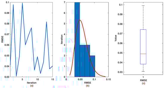 Example 2: (a): The value of RMSE at each iteration; (b): Histogram plot for RMSE; (c): Box plot for RMSE.