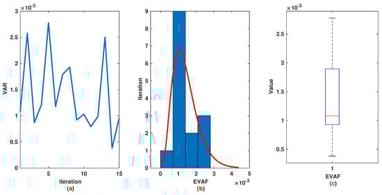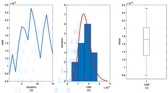 Example 2: (a): The value of VAR at each iteration; (b): Histogram plot for VAR; (c): Box plot for VAR.