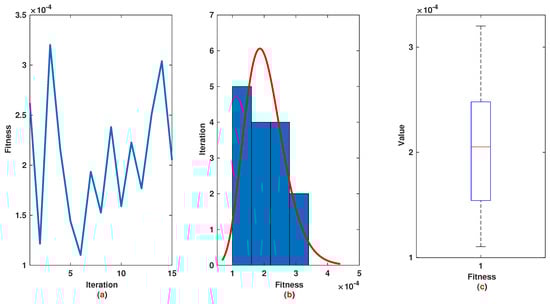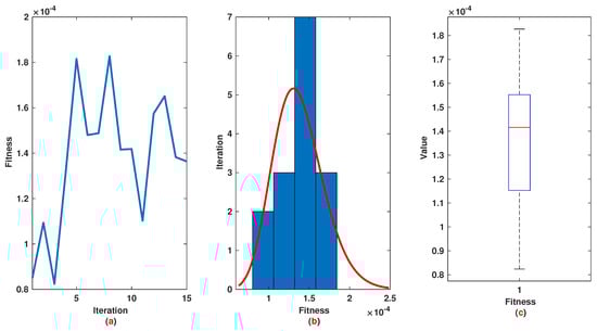 Example 2: (a): The value of FIT at each iteration; (b): Histogram plot for FIT; (c): Box plot for FIT.