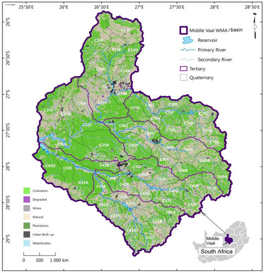 Quaternary catchments in their respective tertiary catchments of the Middle Vaal basin of the Republic of South Africa shown at the bottom right; WMA: water management area.