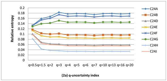 A total of 14 curves displaying identical q-information deviation were identified for WR90 data set. These curves suggested that there was duplication of information/uncertainty in specific QCs. For instance, defining MAR information in one QC was sufficient to define information content in all QCs identical to that QC. For this specific data set, this number was found to be the same as the number of entropy convergence points for q-information deviation curves.