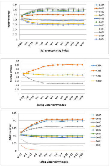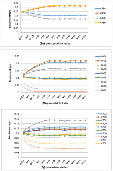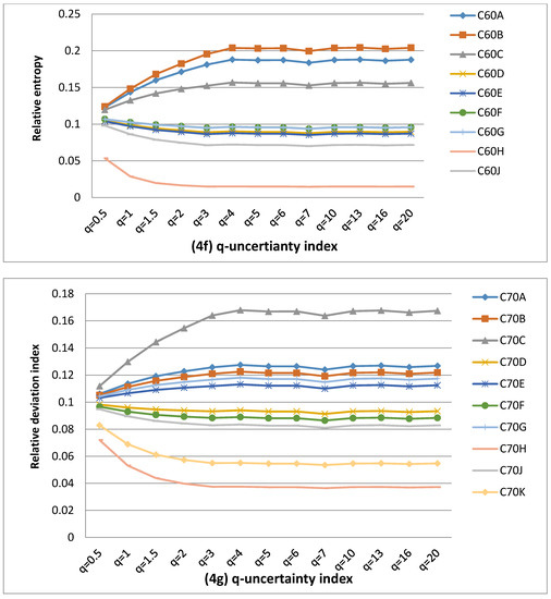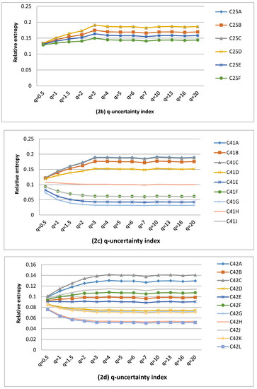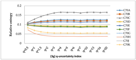 In this study, the difference between the Tsallis entropy and the Shannon entropy is referred to as the q-uncertainty deviation. The values of uncertainty should be expressed in relative terms. Given an i-th TC, the q-uncertainty deviation shows the proportion by which the Tsallis uncertainty contribution of each QC has decreased or increased with respect to its Shannon uncertainty. The Shannon entropy is considered to be the reference, since it shows the ideal case of a system associated with the B-G relationship. Hence, mathematically, the q-information deviation is defined by Equation (7), as given below.