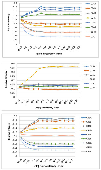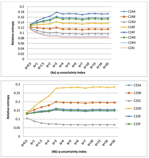 TCs (C42, C70) and C43 scored the highest and lowest numbers of QCs occurrences in terms of positive q-information deviation respectively. This suggested that the requirement for information gain to reduce the level of uncertainty to reach the baseline uncertainty could be more prevalent for C42 and C70 than for C43. However, the highest and lowest numbers of QCs occurred for (C42, C70 and C41) and C25 in terms of negative q-information deviation, respectively. Hence, C42, C70 and C41 would require more loss of information than C25 to reach the baseline uncertainty.