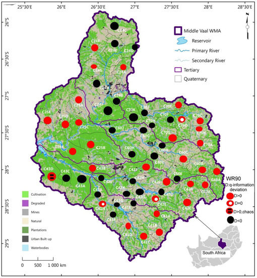 C43D was revealed to be in a chaotic zone; hence, its water resources resilience/sustainability could be compromised, since the q-information deviation was above the threshold. However, the water resources in this QC represent not more than 2% in the Middle Vaal River system and are subject to vulnerability. This could imply that the rest of QCs could outweigh the negative impact (water vulnerability) of C43D on the overall basin in terms of water resources usage. This could support the current practice of transferring water between catchments to resolve the water deficit in some parts of South Africa.