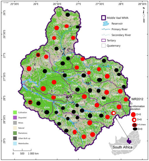 From Table 2, Table 3 and Table 4, generally q-information deviation values were relatively small to be greater than 10%, except for two cases of QCs at the most for each data set. These cases were negligible compared to the rest of QCs in the Middle Vaal basin. In particular, C25D appeared to be the only catchment in the zone of water resource vulnerability for both WR2005 and WR2012. It could mean that no new major hydrological changes occurred in the water resources as far as the different data sets of the Middle Vaal basin were concerned. Similar results were obtained in the case of the Upper Vaal Catchment [3] and could also support the findings of a recent study on the Middle Vaal [5]. This could explain a good approach for the integrated water resource management in South Africa.