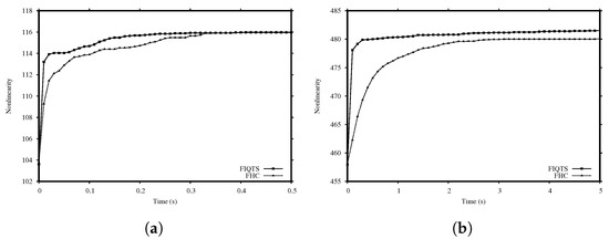 According to the results in Table 1 and Table 2, the cost function is the most adequate cost function for our optimizers. Thus, the cost function is chosen to be used from now on. Moreover, it is noticeable that not only the FIQTS method is slightly better in terms of quality, but it also needs less time. In order to select the method to be integrated in our population-based strategy, it is important to select an inexpensive one with the aim of evolving more generations. In order to decide which method is the most suitable to use in the rest of experiments, we compare the performance of the FHC and FIQTS methods with the cost function , employing a fixed time of 0.5 and 5.0 s for n equal to 8 and 10, respectively. Table 3 shows the results obtained for 50 independent runs for each method. Additionally, Figure 1 shows the evolution of the nonlinearity for the FHC and FIQTS methods with the cost function . The FIQTS method quickly achieves high nonlinearity, so it is preferable for short-term executions, meaning that this is the method selected to be integrated in our population-based approach.