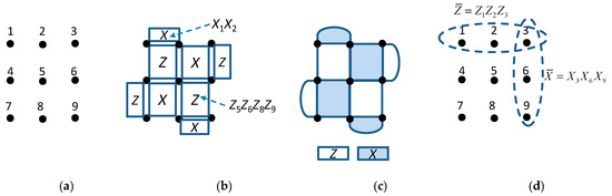 The weight-2 stabilizers are allocated around perimeter, while weight-4 stabilizers are located in the interior. The logical operators for this code are run over both sides of the lattice, as shown in Figure 1d, and can be represented as . The codeword length is determined as the product of side lengths, expressed in number of qubits, and, for the surface code from Figure 1, we have that n = Lx × Lz = 3 × 3 = 9. On the other hand, the number of information qubits is k = 1. The minimum distance of this code is determined as the minimum side length, that is d = min(Lx,Lz) = 3, indicating that this code can correct a single qubit error.