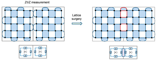 In surface codes, this corresponds to the lattice surgery [14,15], in which we change the configuration as shown in Figure 3 (right) by introducing the patches with dark-red edges; after that, we measure the stabilizers for d cycles to get the outcome of measurements, and split again. The cost associated with the lattice surgery is 1 t.s. This represents the way to introduce the entanglement between two adjacent patches. Namely, we start with the state |++⟩ = 0.5(|00⟩ + |11⟩ + |01⟩ + |10⟩) and perform the measurement on Z⊗Z operator. If the result of the measurement is +1, the qubits end up in state 2−1/2(|00⟩ + |11⟩); otherwise, they end up in state 2−1/2 (|01⟩ + |10⟩). In either case, the qubits are maximally entangled. We can apply the similar procedure to the X⊗Z product operator. Of course, it is also possible to measure the product operator involving the Y operator, which is really not needed in our proposed QCNs. What is even more interesting is that it is possible to measure the product for more than two encoded Pauli operators through multi-patch measurements [14].