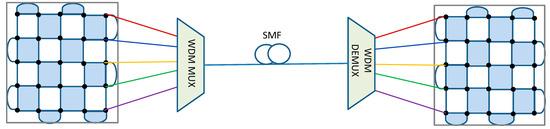 To enable the next generation of quantum communication networking, we propose to employ the surface codes so that the logical qubits are located at different nodes in the network. The logical qubits are represented by the patches introduced in the previous section. For simplicity, we assume that the surface code is defined on a d × d grid. The neighboring nodes are connected by employing d wavelengths, as illustrated in Figure 4. Some of the optical links could be FSO links.