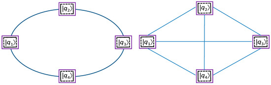 By performing the Z⊗Z measurement, as described in the previous section, the logical qubits create the Einstein–Podolsky–Rosen (EPR) pair. The results of the measurements have been passed to the SDN controller, which will know the exact EPR pair being created. To create the desired QCN, the corresponding product measurements need to be simultaneously performed. As an illustration, let us consider the ring network composed of four nodes, as shown in Figure 5 (left), with each node being equipped with the surface code patch representing the corresponding logical qubits. In principle, one surface patch can be split between multiple nodes, but, to facilitate explanations, we assume that each node contains a single SC patch. By performing the simultaneous product Z⊗Z measurements between logical qubits q1 and q2, q2 and q3, q3 and q4, q4 and q1, we can entangle the nodes 1–4 and thus create the ring QCN. On the other hand, for the four-node mesh network shown in Figure 5 (right), by performing the simultaneous product Z⊗Z measurements between logical qubits q1 and q2, q2 and q3, q3 and q4, q4 and q1 as well as the simultaneous X⊗X measurements between q1 and q3, q2 and q4, we can entangle the four qubits into the mesh configuration. By providing the results of the measurements to the SDN control plane, the exact maximum entangled state between nodes in the QCN will be known. Clearly, this approach allows us to entangle the logical qubits in an arbitrary network. The trapped ions-based technology represents a perfect candidate for practical implementation of the proposed QCN. By equipping every node in the proposed QCN by multiple qubit patches, in principle, we can simultaneously perform quantum networking and quantum distributed computing. Instead of wavelength-division multiplexing (WDM), the multicore fiber can also be used to connect the logical qubits [16]. The proposed QCN does not require the trusted node assumption, but it is assumed that Eve does not have access to SDN controller.