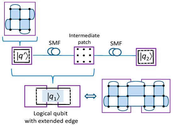 To extend the transmission distance between neighboring nodes in QCN, we propose to use the quantum error correction (QEC)-based repeaters. So far, QEC-based repeaters are based on two-dimensional QE-based repeaters, such as the dual-containing Calderbank–Shor–Steane (CSS)-codes-based repeaters [17] and surface-codes-based repeaters [18]. Unfortunately, dual-containing CSS codes are essentially girth-4 quantum low-density parity-check (LDPC) codes with poor error correction performance [19]. On the other hand, the surface codes proposed in [18] introduce large latency and are not compatible with the QCN proposed in the previous section. Here, we propose a different approach to interpret an intermediate node as an SC patch and apply the patch deformation approach due to Litinski and thus extend the logical qubit to two spatially separated patches, which is illustrated in Figure 6. In this example, three wavelengths are needed to interact remote patches. Once the logical qubit is extended to the intermediate node, we further perform product X⊗Z measurements to entangle the logical qubits q1 and q2. This approach is applicable to several intermediate nodes, thus offering the potential to significantly extend the distance between any two desired nodes in the QCN.