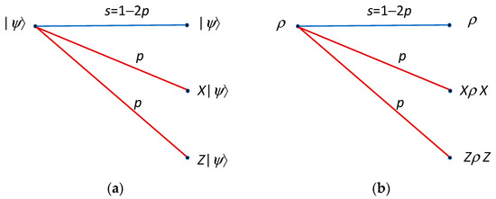 Although the channel loss dominates the performance of quantum repeaters, there will be quantum errors associated with each stage, which can be represented by using the quantum channel model provided in Figure 7, where X and Z quantum errors occur with the same probability p. The corresponding Kraus representation [1] is given by: