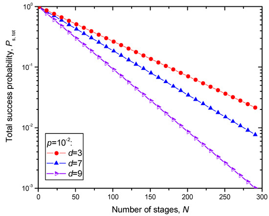 So, [1 − P(E)]T represents the success probability for the single stage. The total success probability can be estimated by {[1 − P(E)]T}N and is illustrated in Figure 8 by setting the X (Z) qubit error probability to p = 10−2 and transmissivity to T = 1, for different d × d surface codes.
