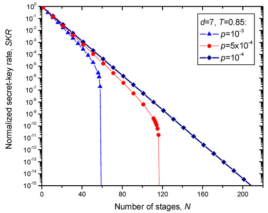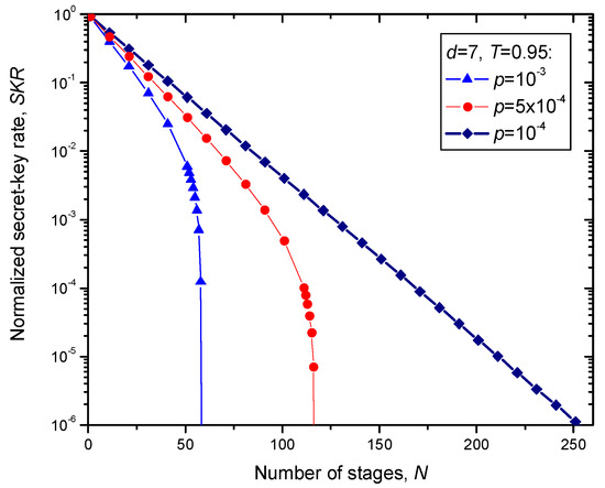 The numerical results for secret-key rate (SKR) for different transmissivities T (assuming that fe = 1) vs. the number of stages N are summarized in Figure 9 and Figure 10. The channel transmittance in Figure 9 is set to T = 0.95, while in Figure 10 it is set to T = 0.85. The qubit error transition probability p is used as a parameter. In both figures, the 7 × 7 surface code is used. Given that the effective transmission distance of the fiber is given by [20]: