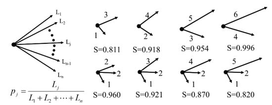 This entropy (S) has the property that the closer the branch lengths of the network are, the closer its value is to 1.0, and the lower the similarity, the closer the value is to 0.0 []. To demonstrate this property, we have provided an example where two branch lengths increased by the same length, and another example where only one of the three branches increased. In the former case, the S value increased, while in the latter case, the S value decreased.